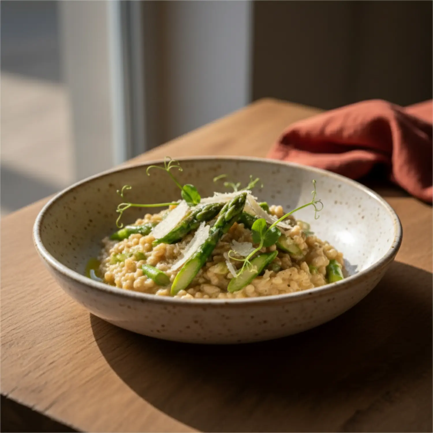 Découvrez notre risotto d’épeautre aux asperges vertes croquantes et copeaux de vieux Comté.